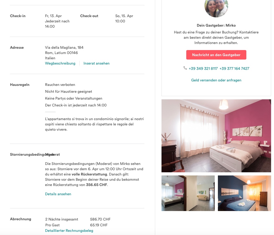Gesamtkosten: 586.70 CHF, 65.19 CHR (etwa 55 EUR) pro Gast für die beiden Nächte.